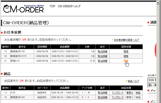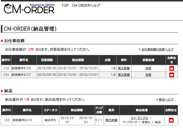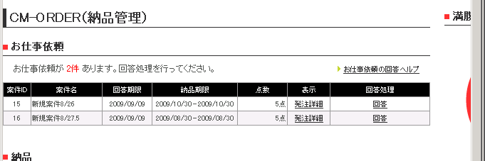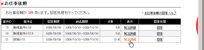 お仕事の依頼があると、CM-ORDER TOPに「お仕事依頼」が表示されますので、「発注詳細」を確認して、その依頼を請けるか請けないかを「回答」リンクをクリックしてご回答ください。