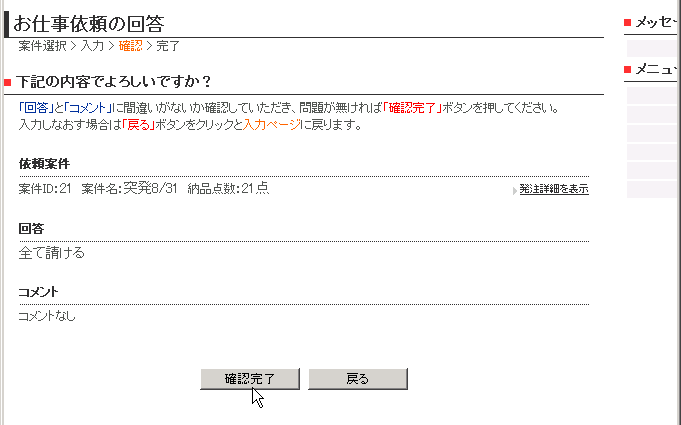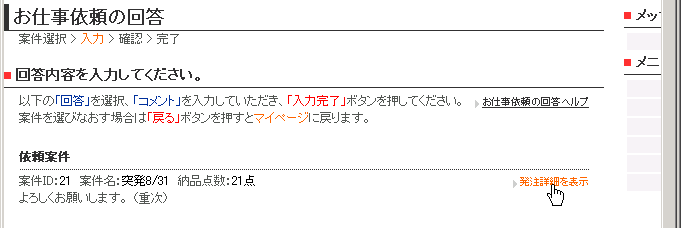 ご回答は、発注詳細ページで発注内容をご確認いただいた上でお願いします。