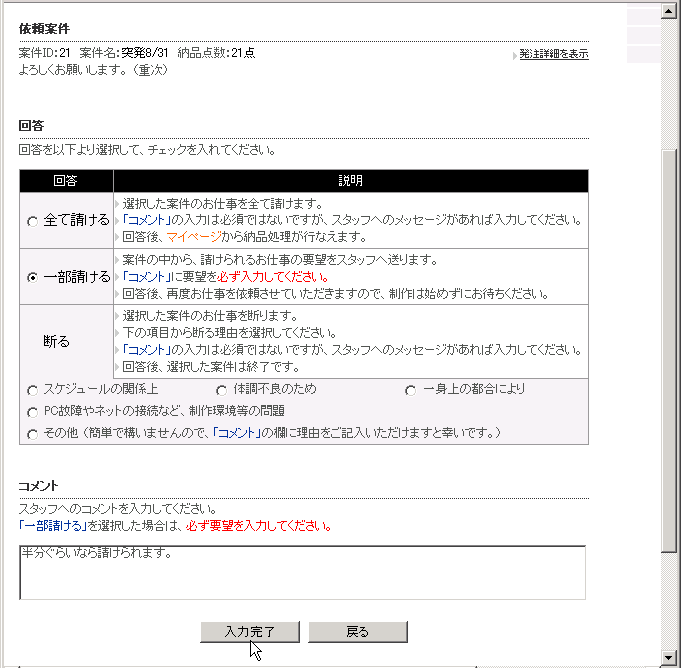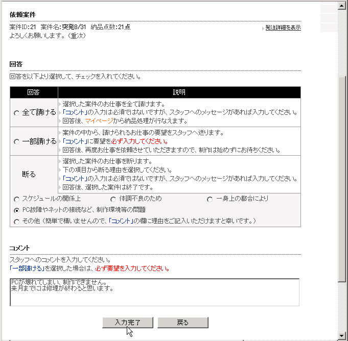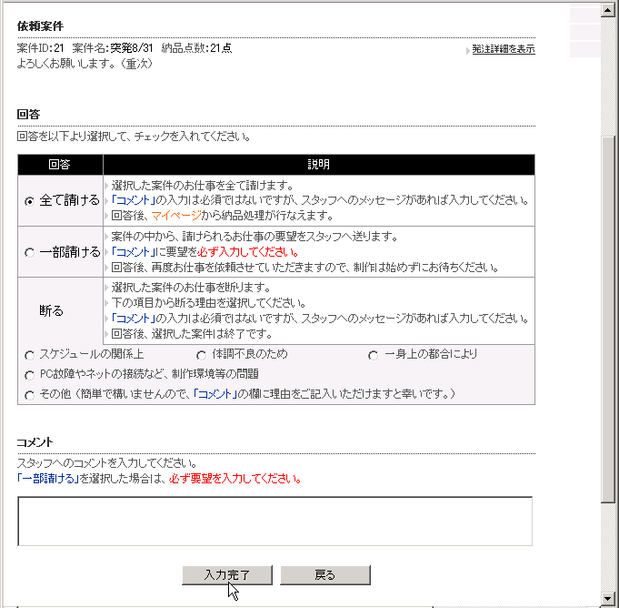 次に、請けるか請けないかを回答していただきます。「お仕事依頼の回答」ページでは、「回答」欄から「全て請ける」「条件つきで請ける」「断る」を選択後、「コメント」を入力し、「入力完了」ボタンをクリックしてください。確認ページに進みます。